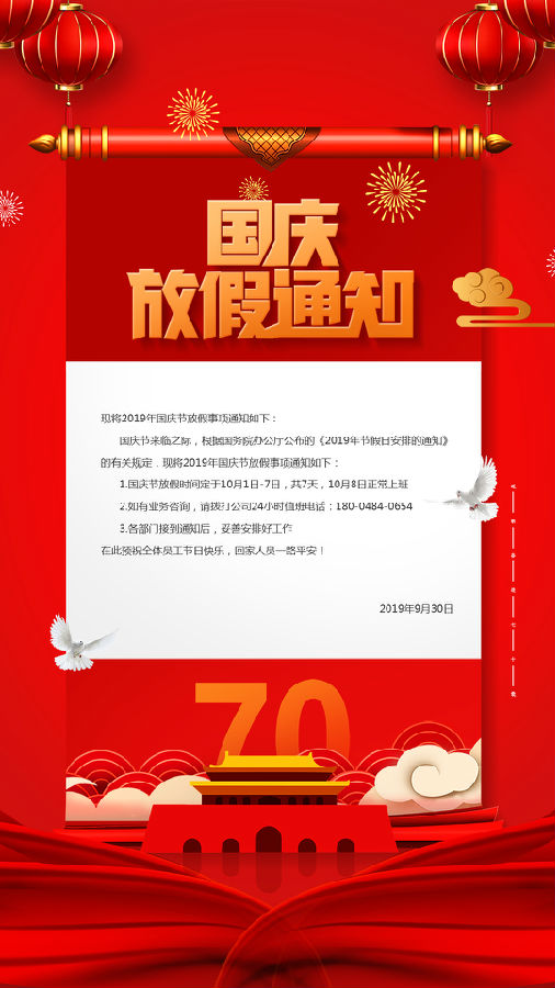 國慶節(jié)將至,根據(jù)2019年國慶放假時(shí)間安排,并結(jié)合我公司具體情況決定,現(xiàn)將2019年國慶節(jié)放假事項(xiàng)通知如下: